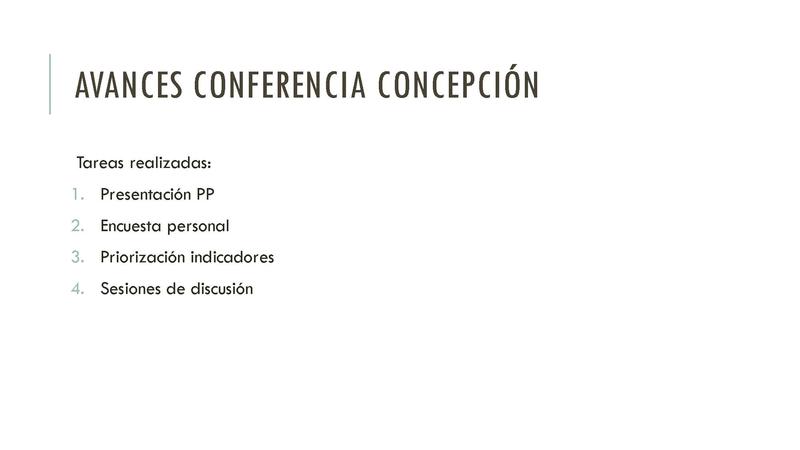 Presentacion de Helen y Athena en la reunion de grupo de trabajo de indicadores, 23 Abril 2015 sobre los resultados de encuesta hecho en la conferencia en Concepción